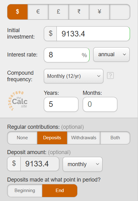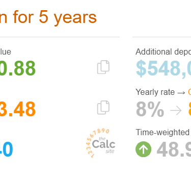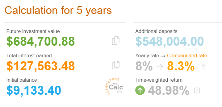 很粗略地計算就是要用$500,000每年賺到$56,530.6,每月約$4711,持續五年。這樣分拆了感覺又有多了一點信心。